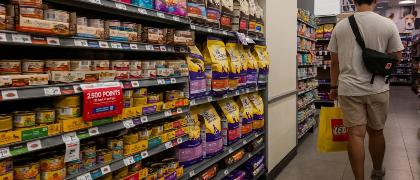 People shop for pet supplies at a pet retail store in New York City, Aug. 12, 2025.