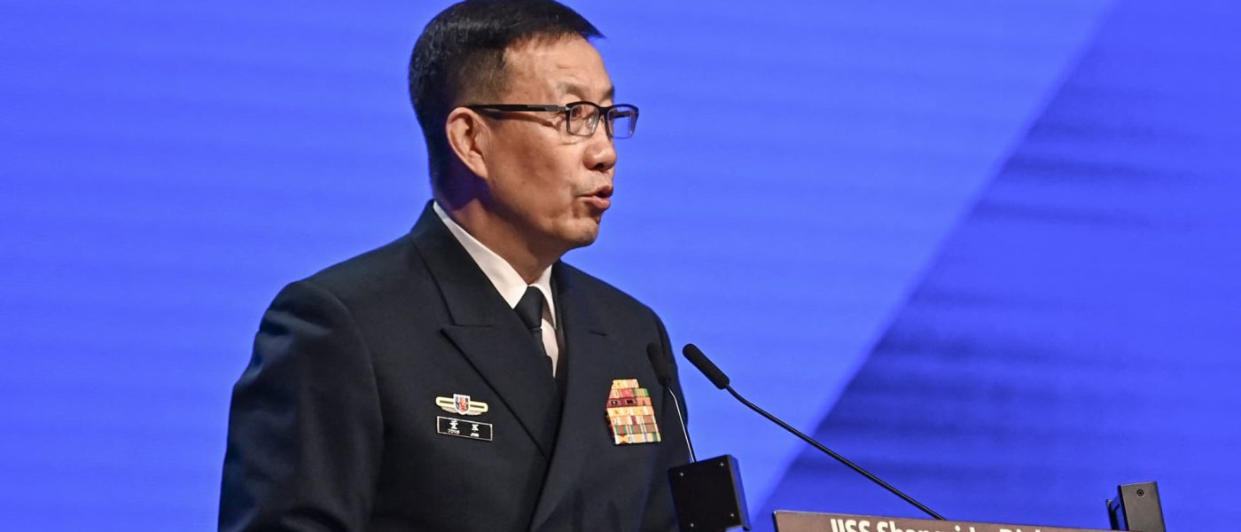 China’s Defense Minister Dong Jun speaks during the 21st Shangri-La Dialogue summit in Singapore on June 2, 2024.