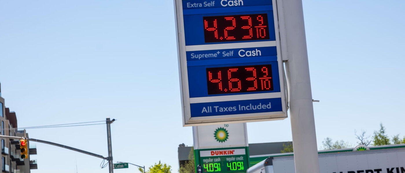 Gas prices are displayed at a station in Brooklyn on April 21, 2026 in New York City.