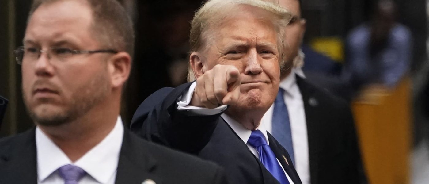 Former US President and Republican presidential candidate Donald Trump points as he arrives back at Trump Tower after being convicted in his criminal trial in New York City, on May 30, 2024.