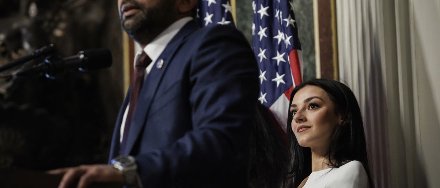Alexis Wilkins looks at her boyfriend, Kash Patel, as he speaks after being sworn in as the new Director of the Federal Bureau of Investigations (FBI) by U.S. Attorney General Pam Bondi in the Eisenhower Executive Office Building at the White House on Feb. 21, 2025 in Washington, D.C.