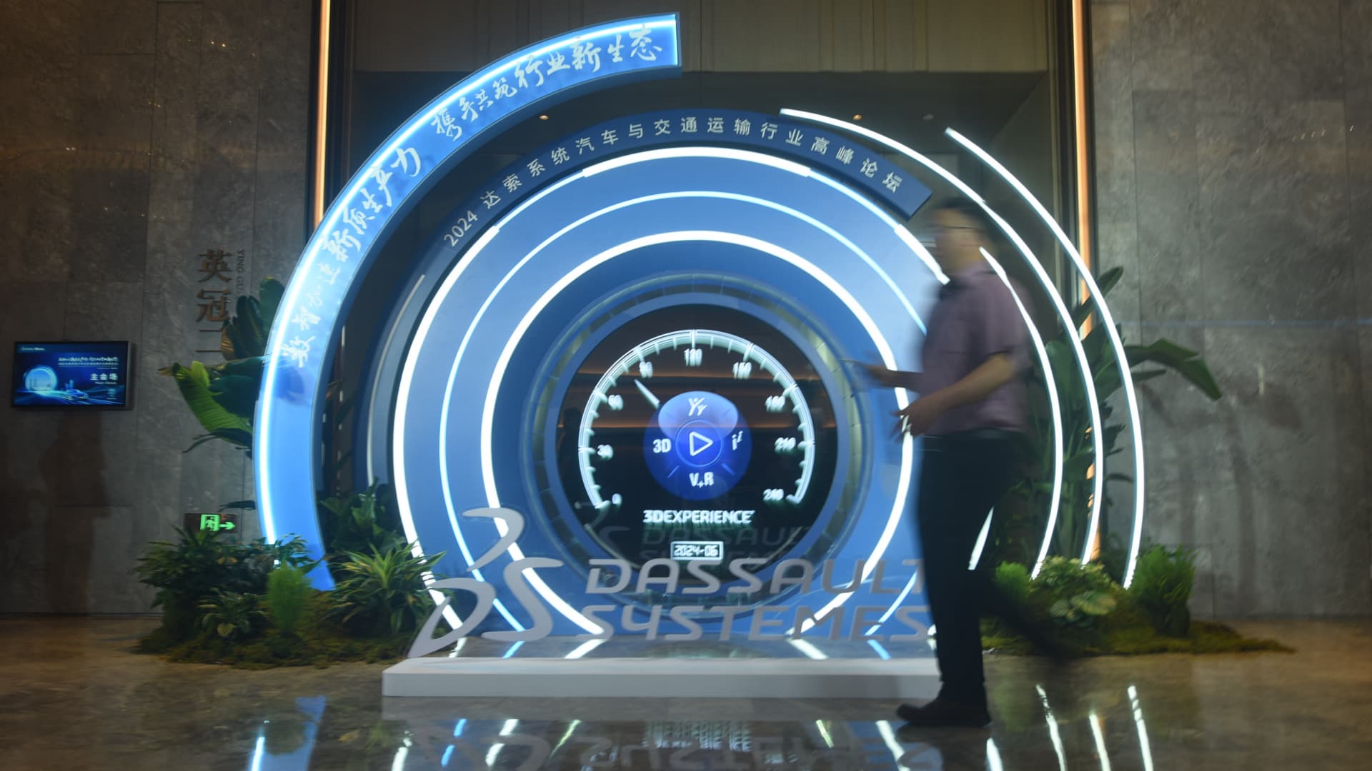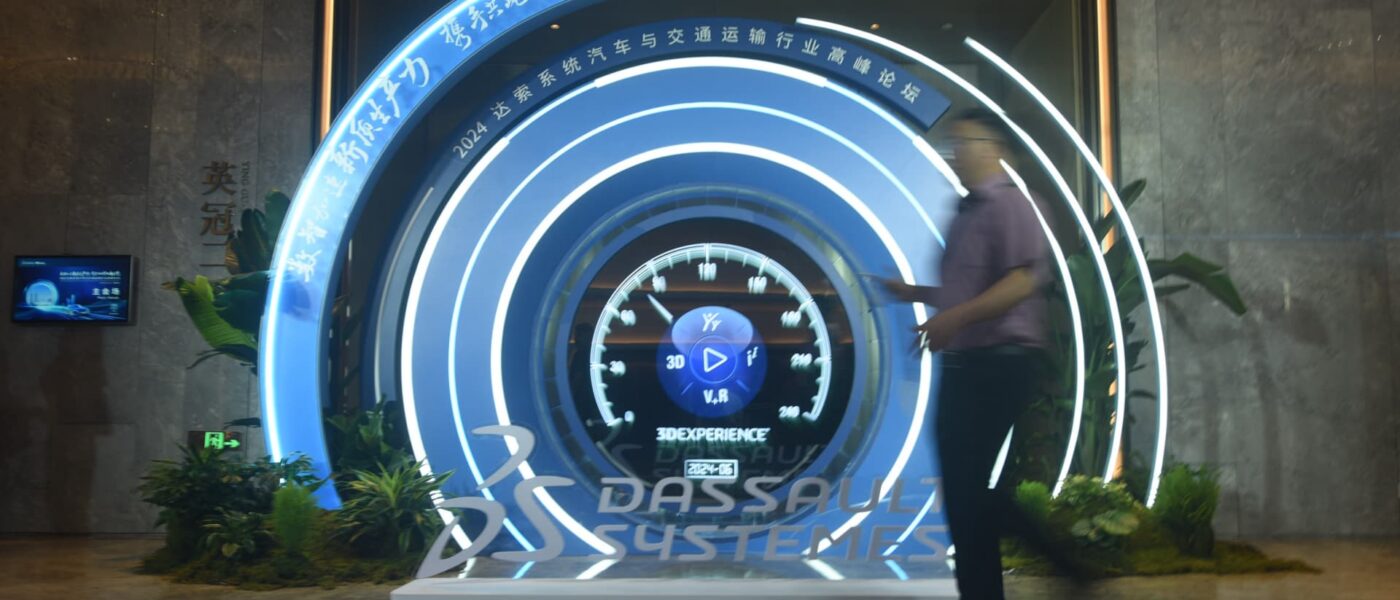 HANGZHOU, CHINA – JUNE 14, 2024 – A guest walks past the logo of the 2024 Dassault Systemes Automotive and Transportation Industry Summit Forum in Hangzhou, Zhejiang province, China, June 14, 2024. (Photo credit should read CFOTO/Future Publishing via Getty Images)
