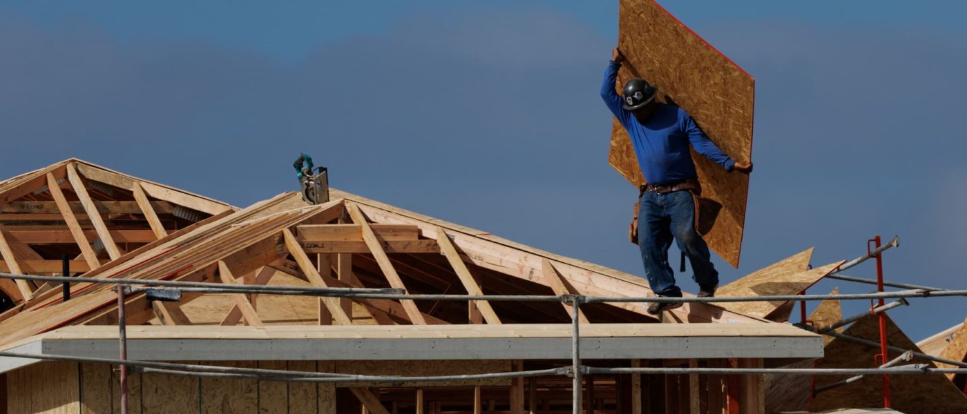 A construction worker carries a sheet of OSB sheathing as he builds a roof on a residential homes in Irvine, California, U.S., March 28, 2025.