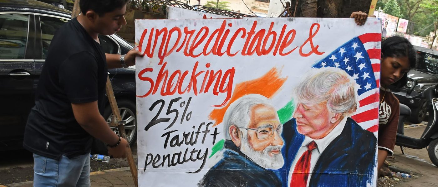 Students from Gurukul School of Art, carry a poster of Prime Minister of India Narendra Modi and U.S. President Donald Trump on India outside their school. U.S. President Donald Trump imposed a 25% tariff on India along with penalties for buying oil and military equipments from Russia.