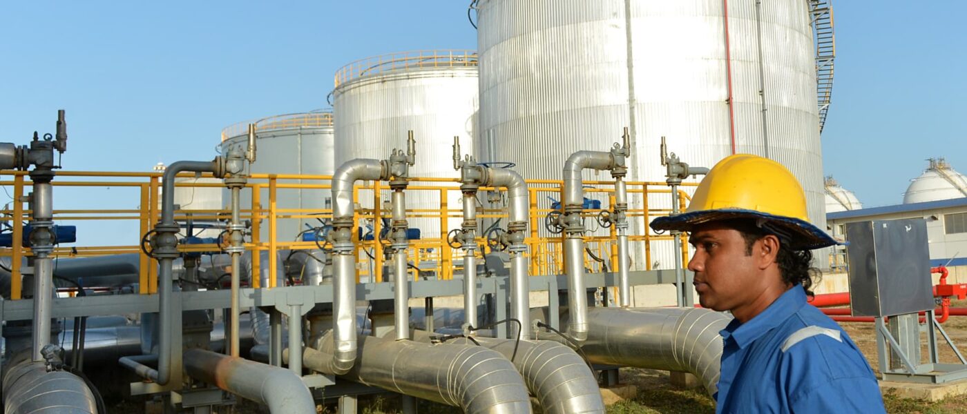 A Sri Lankan worker walks past 76 million dollar oil tank farm at the southern deep sea port of Hambantota on June 22, 2014. Sri Lanka is hoping its new harbour in the southern tip of the island would emerge a key refuelling centre along the East-West sea route. AFP PHOTO/ Ishara S. KODIKARA (Photo credit should read Ishara S.KODIKARA/AFP via Getty Images)