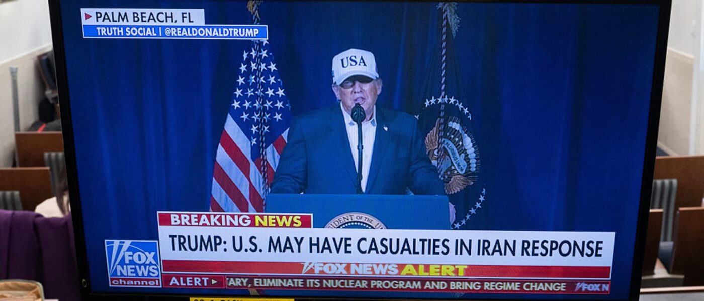 A monitor plays footage of US President Donald Trump announcing US and Israeli strikes against Iran in the James Brady Press Briefing Room of the White House in Washington, DC, U.S., on Saturday, Feb. 28, 2026.
