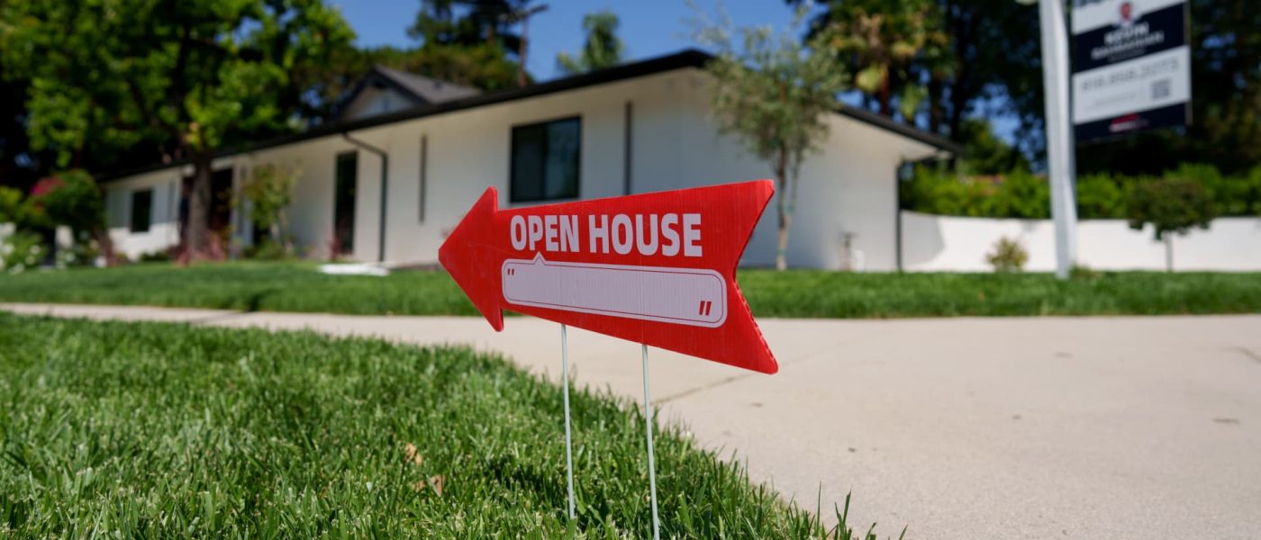 An “Open House” sign in front of a home for sale in the Woodland Hills neighborhood of Los Angeles, California, US, on Sunday, July 13, 2025.