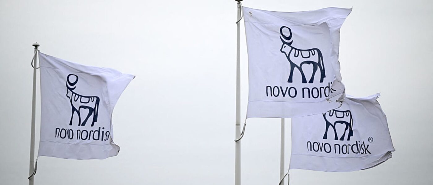Flags with the logo of Novo Nordisk flutter next to the company’s factory in Hillerod on Nov. 12, 2025.