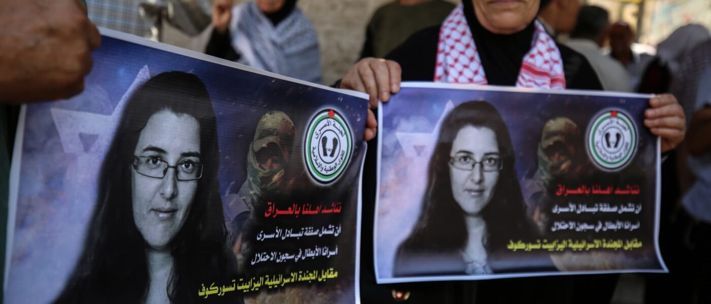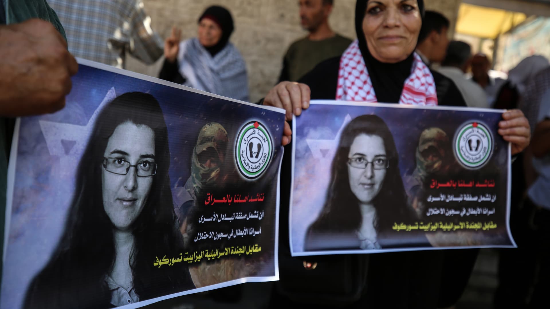 Members of the Palestinian Prisoners Committee hold a rally outside the International Committee of the Red Cross (ICRC) office in Gaza City on July 17, 2023, demanding the Iraqi government to include Palestinian prisoners in Israeli jails in the exchange for Israeli-Russian academic Elizabeth Tsurkov.