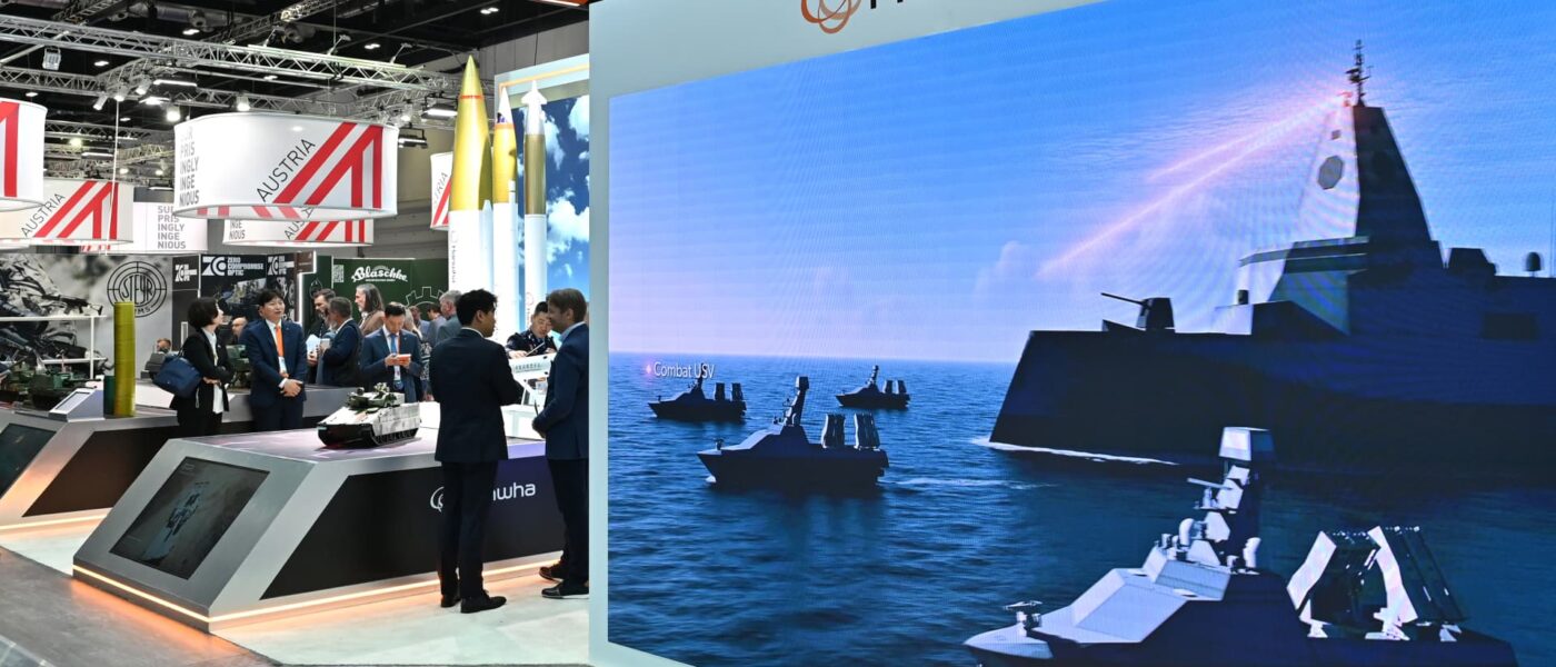A large screen displays images of Combat Unmanned Surface Vessels (USV) at the Hanwha exhibition stand during the Security Equipment International (DSEI) at London Excel on Sept.10, 2025 in London, England.