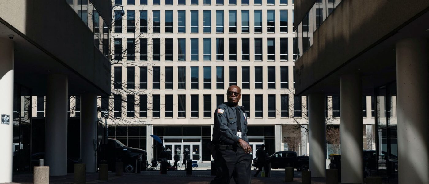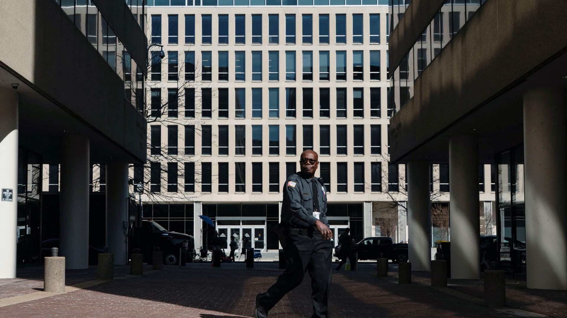 A security guard walks past the U.S. Department of Education headquarters in Washington, D.C., March 12, 2025.