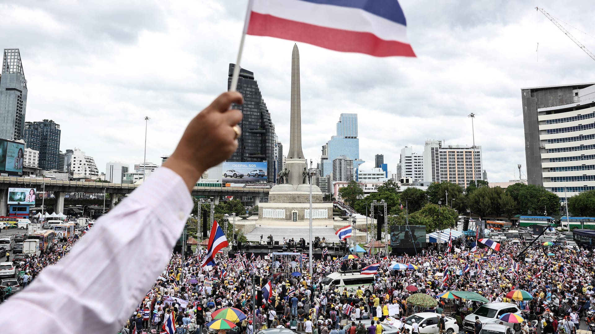Protesters waved flags beside Victory Monument, a war memorial at a busy intersection, in a demonstration organised by the United Force of the Land, a coalition of largely nationalist activists who have rallied against other
