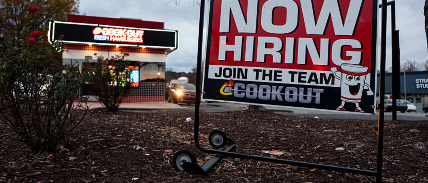 A “Now Hiring” sign at a Cookout fast-food restaurant in Durham, North Carolina, Nov. 25, 2025.