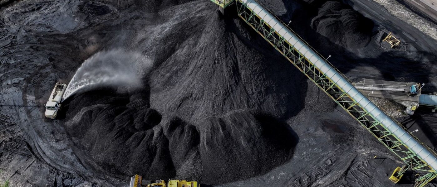 A drone view shows coal being prepared for transport, along the Kanawha river outside of Charleston, West Virginia, March 19, 2025.