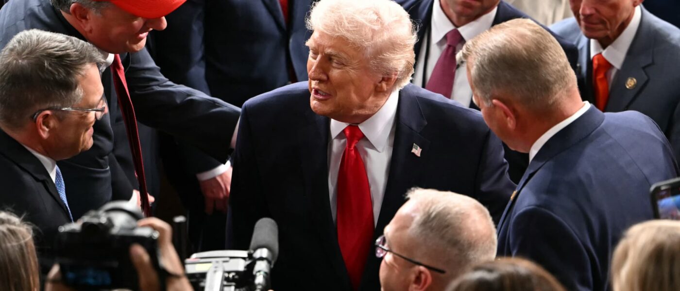 U.S. President Donald Trump shakes hands with members of Congress as he departs following his State of the Union address in the House Chamber of the US Capitol in Washington, DC, on Feb. 24, 2026.
