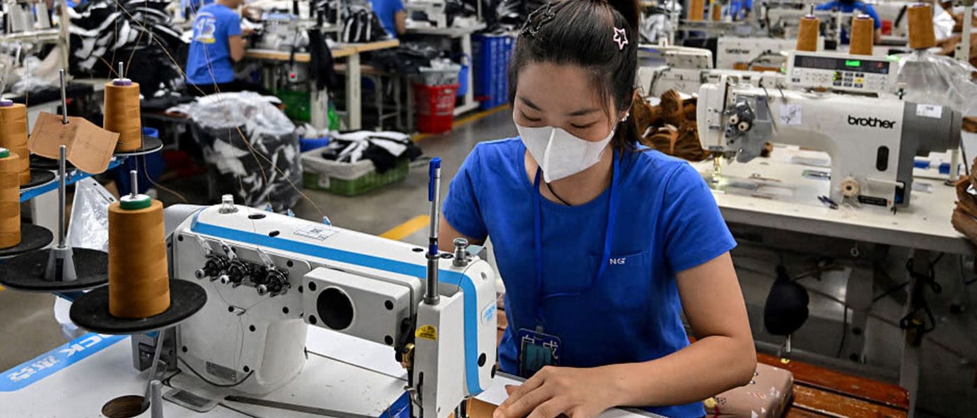 A worker stitches apparels at a garment factory in Vietnam’s Thai Nguyen Province on July 2, 2025.
