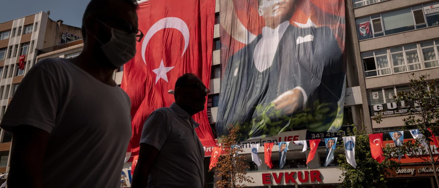 A Turkish national flag, left, and a flag bearing the portrait of Kemal Ataturk, founder of the modern Turkish republic, hang from the exterior of a building in the Sisli district of Istanbul, Turkey, on Monday, Aug. 29, 2022.