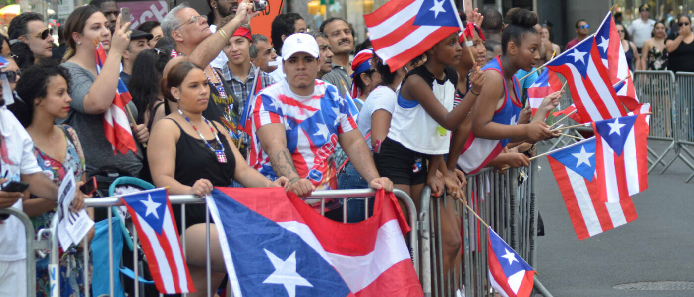 People seen holding Puerto Rican flag during the annual Puerto Rican Day Parade on 5th Avenue in New York City.