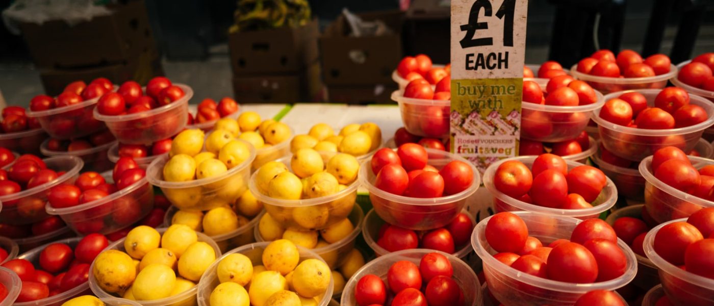 A one pound price label in bowls of produce on a grocery stall at East Street Market in London, UK, in spring 2024.